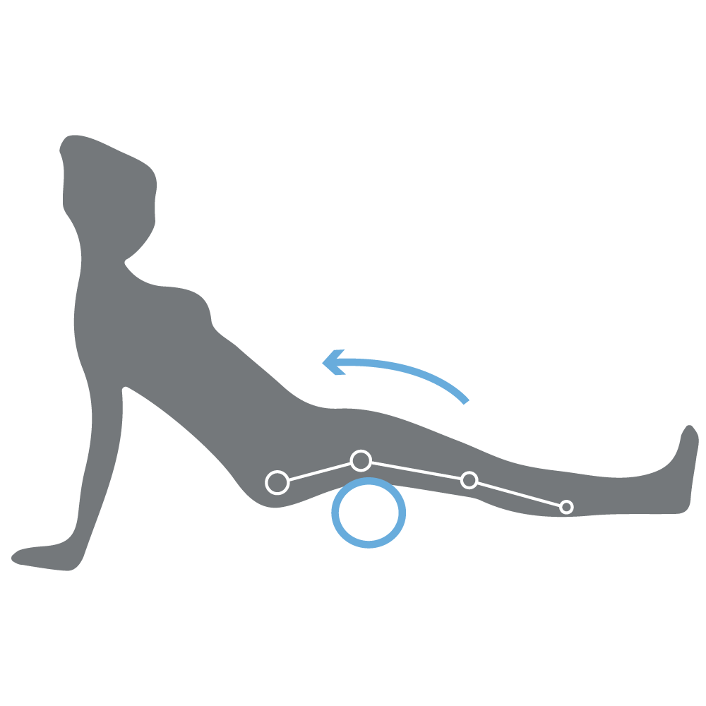 Setze Dich & lege das Core oder Relax-Rad unter den Bereich Deines Beins (Oberschänkel oder Waden) den Du massieren möchtest. Stütze deinen Körper mit den Händen vom Boden ab und rolle hin & her. Bei verspannten Punkten halte den Druck punktiert & fühle die Massage.