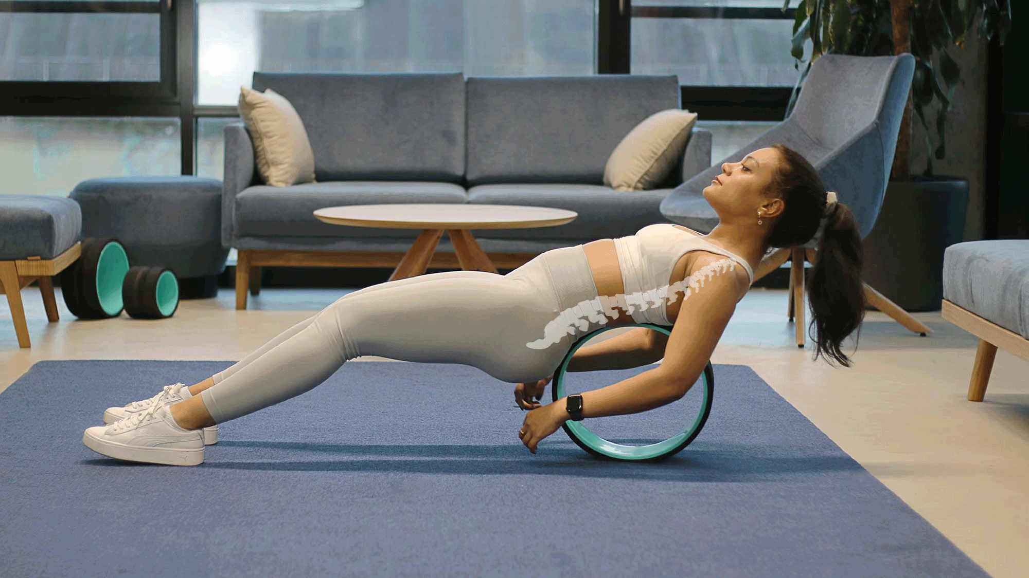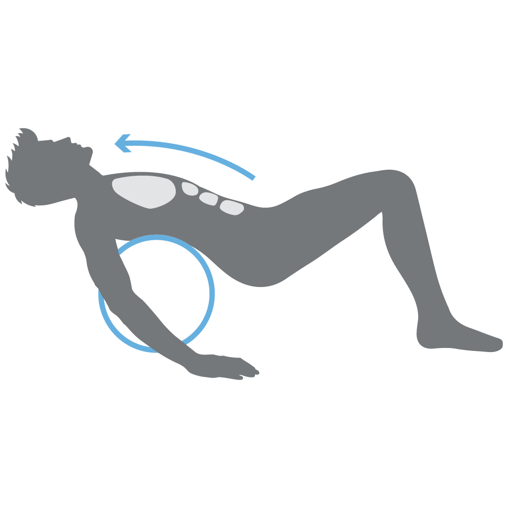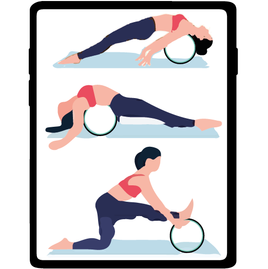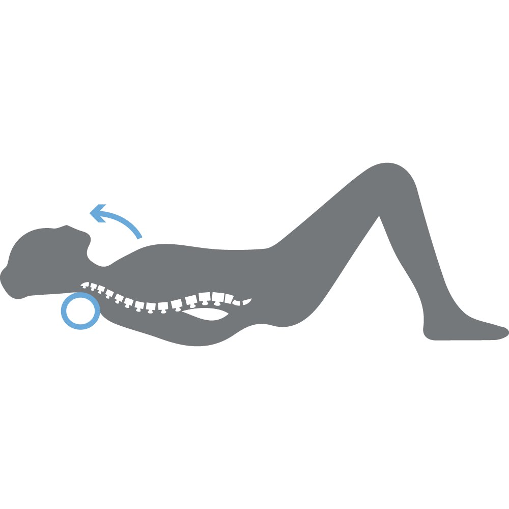 Setze Dich vor das Rad & richte das Rad in der Mitte des Rückens aus. Lehne dich mit dem unteren Rücken gegen das Rad & fühle die sanfte Dehnung. Hebe dann deine Hüfte an. Mit Hilfe der Beine rollst Du nun vor und zurück. Dabei massierst du die Rückenmuskulatur & erlebst die Vorteile der Faszienlösung & der Dehnung der Wirbelsäule.