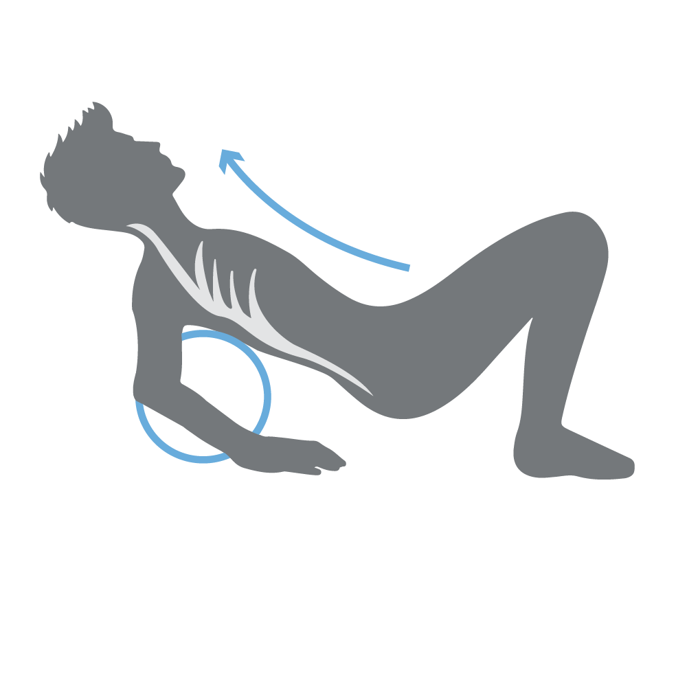 Durch Muskeltraining & falsche Körperhaltung verkürzt sich der Brustmuskel. Das verspannt den oberen Rücken. Durch Dehnung der Brustmuskulatur & Massage des oberen Rückenmuskel wird sogar die Rückbildung des Rundrücken trainiert.